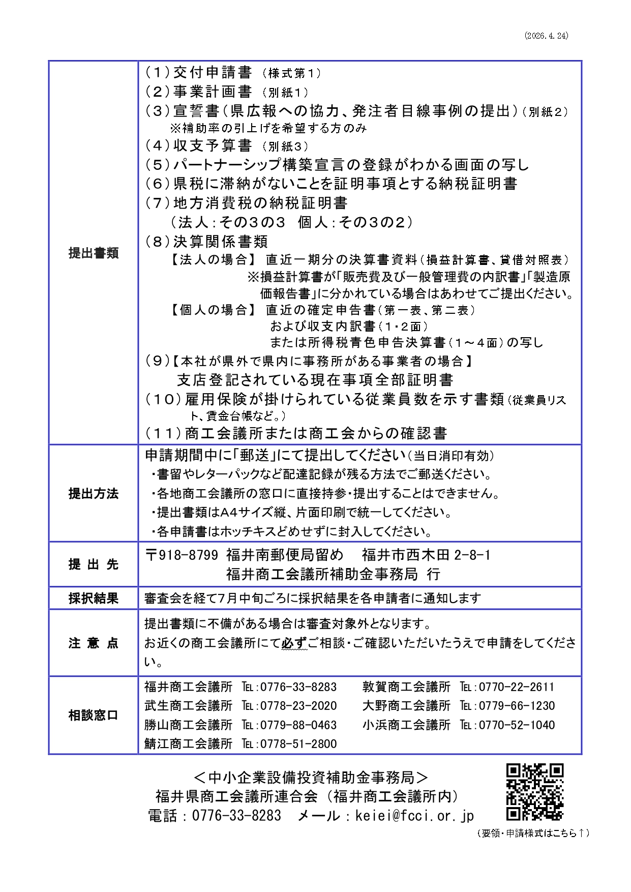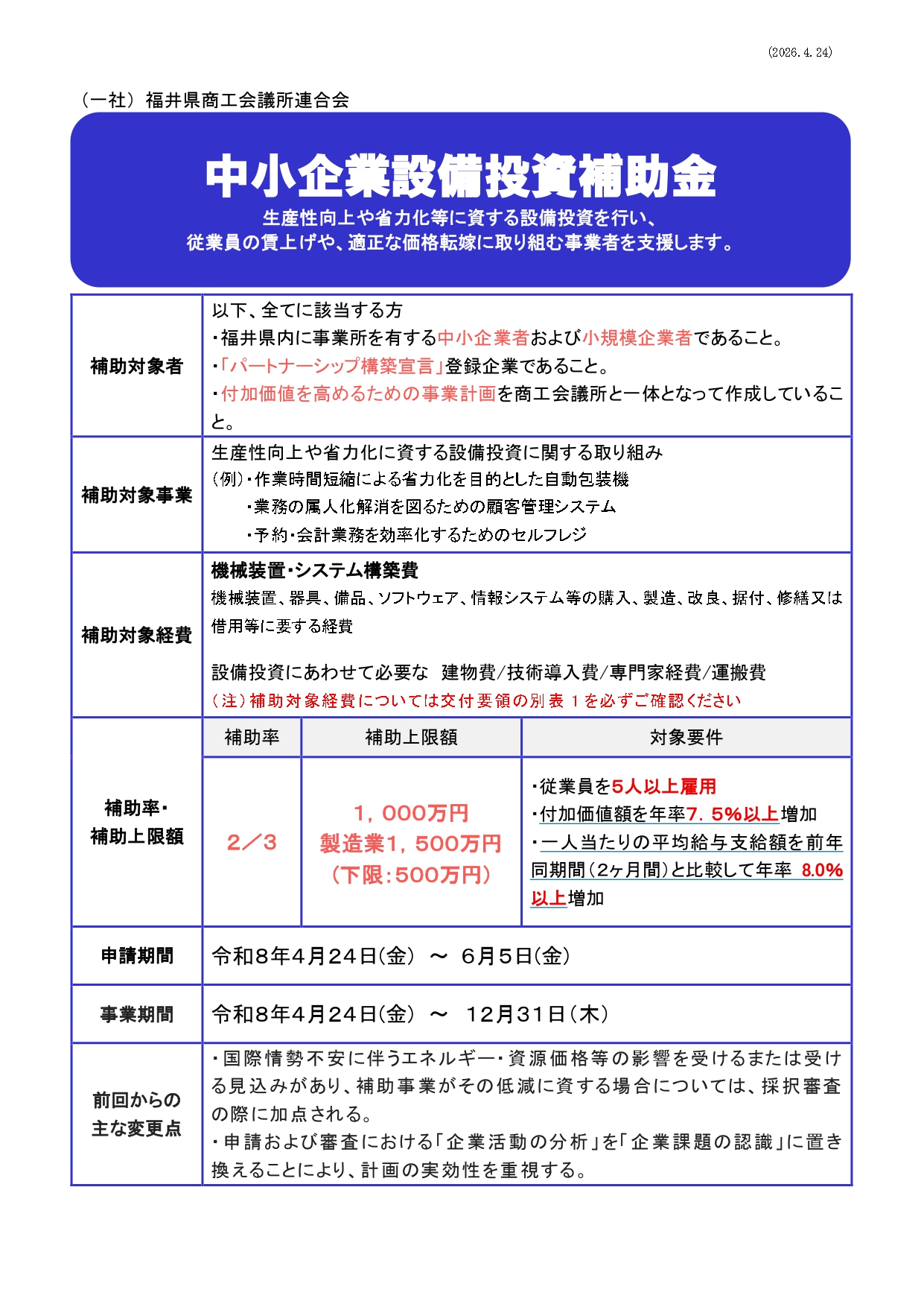※申請内容の精査のため、当所での申請確認締切日を申請受付締切の1週間前(2026年5月29日(金)まで)に設定させていただきます。尚、事前にご相談いただいております事業所様に関してはこの限りではございません。締切を過ぎての申請は、当所での対応はいたしかねますので、申請をお考えの方は余裕をもって当会議所までご相談ください。ご理解とご協力のほどよろしくお願いいたします。