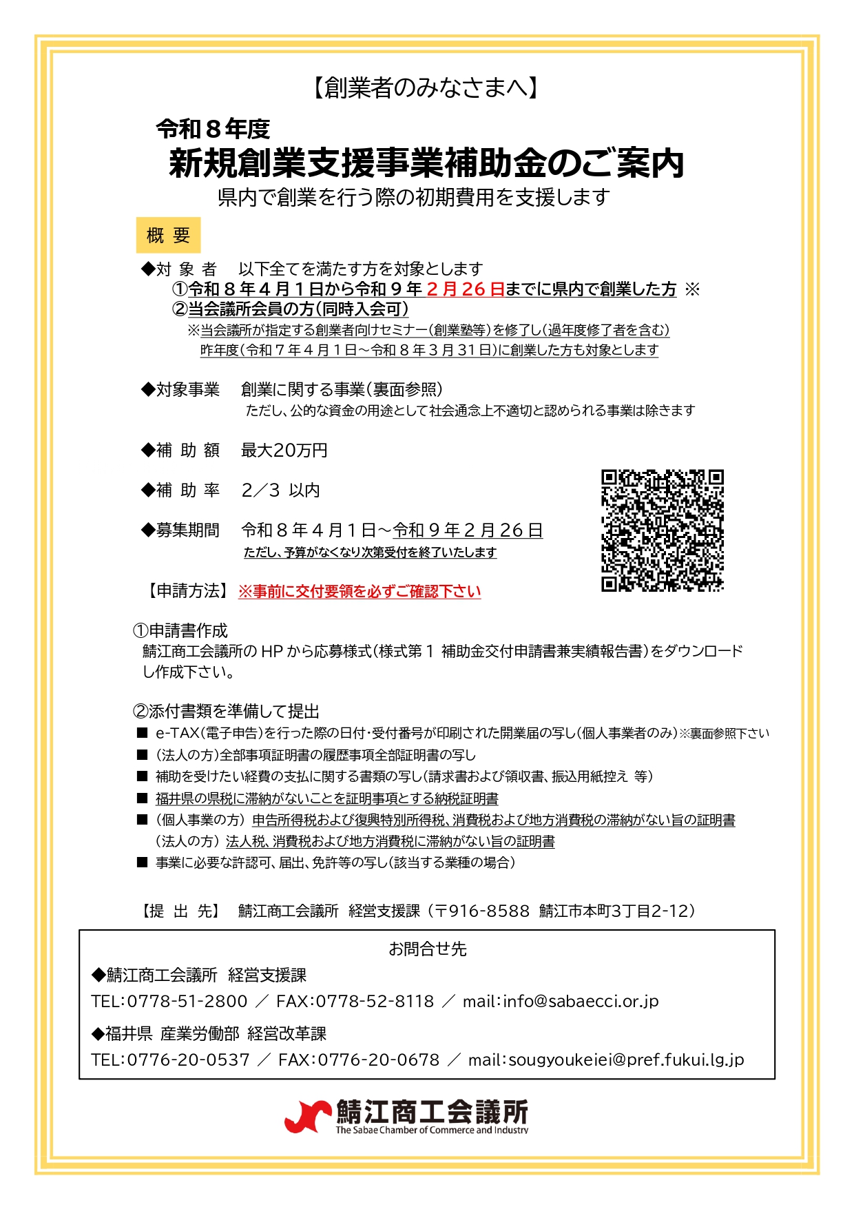 令和8年度新規創業支援事業補助金 公募のご案内 お知らせ 2026.04.10 ※予算に達し次第、受付を終了いたします。申請をお考えの方はお早めにご相談下さい。 また下記の申請様式一式(事業計画書)の策定・提出をもって「申請受理」とさせていただきます。※原則として予約は受け付けておりませんのでご了承下さい。 チラシダウンロード 交付要領ダウンロード 申請様式一式Wordダウンロード