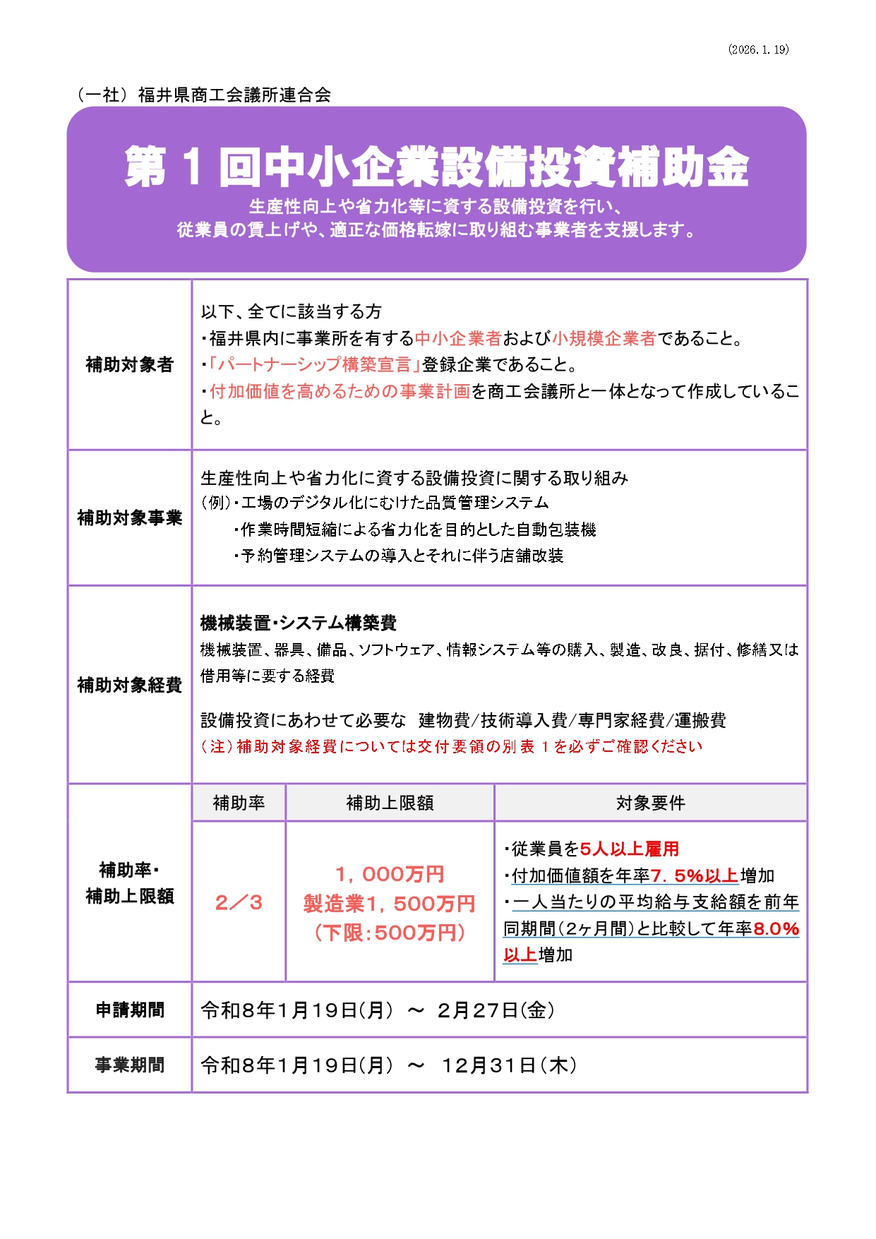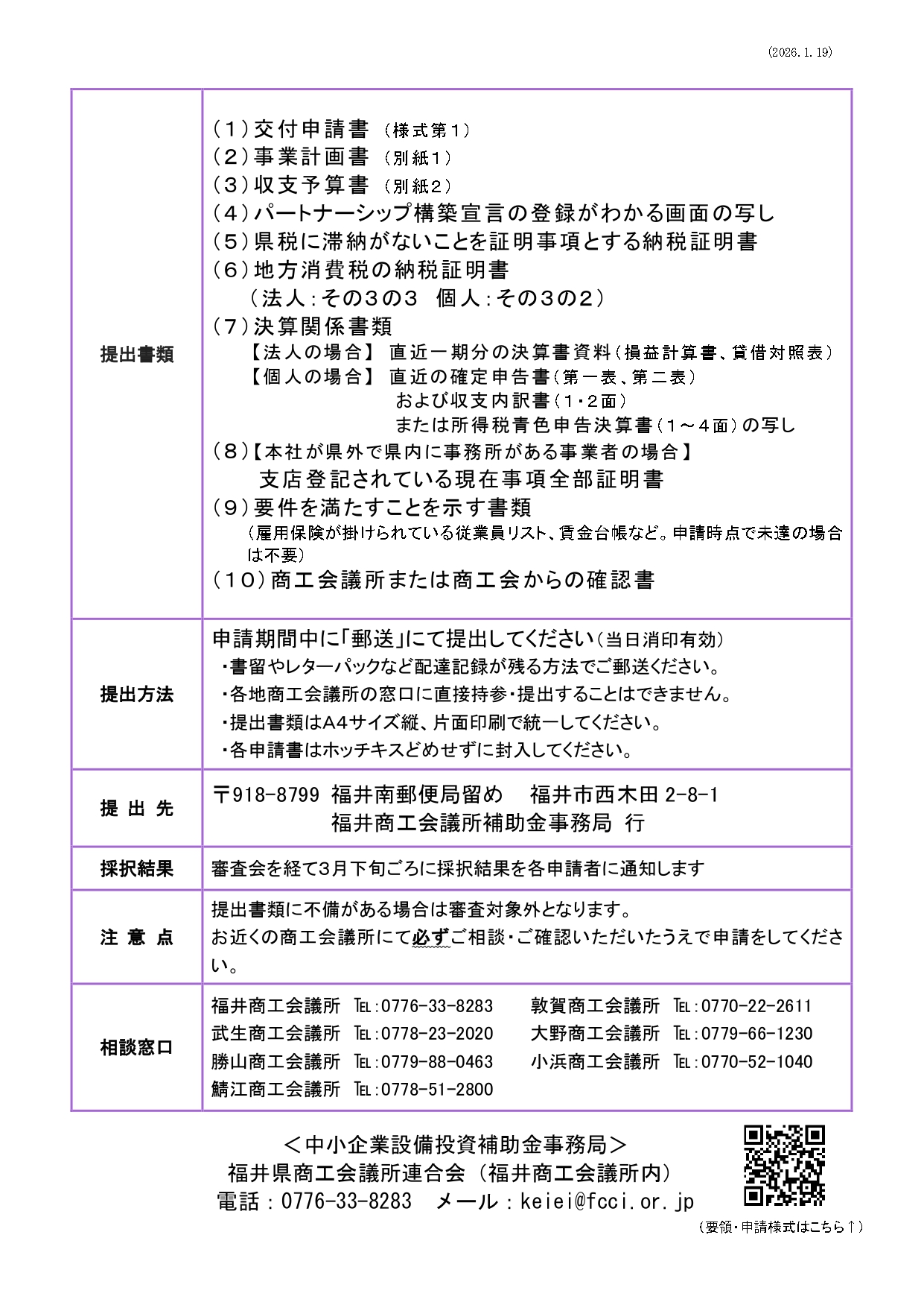 下記チラシ〈注意点〉に記載の通り、本補助金の申請においては事前に近くの商工会議所への相談・確認を要しますが、当会議所においては相談締切を 2月20日(金)17時 とさせていただきます。