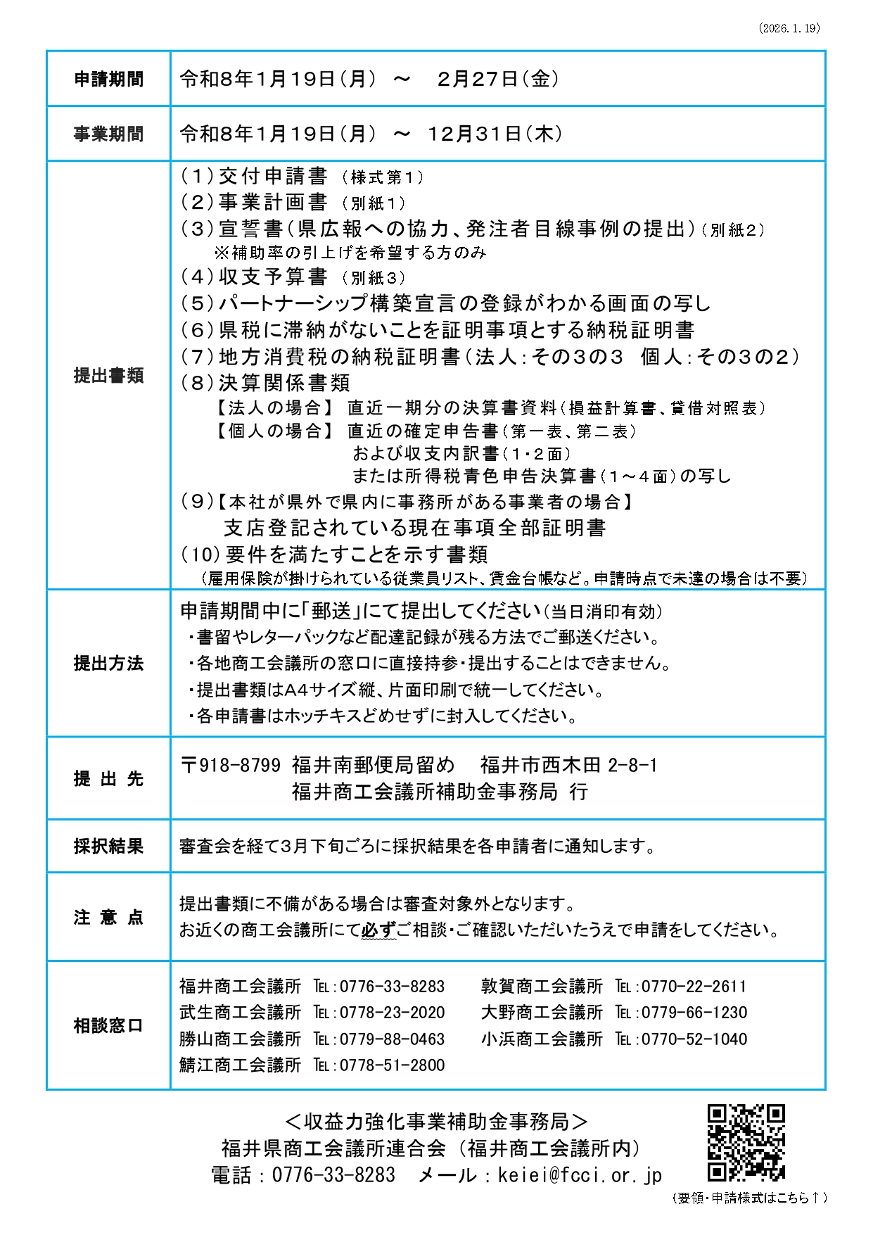 下記チラシ〈注意点〉に記載の通り、本補助金の申請においては事前に近くの商工会議所への相談・確認を要しますが、当会議所においては相談締切を 2月20日(金)17時 とさせていただきます。